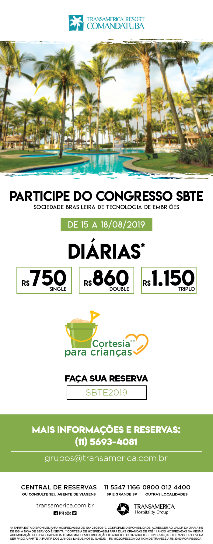 Veja abaixo os valores das diárias para hospedagem no Transamerica Resort Comandatuba. Para maiores informações, clique aqui.
